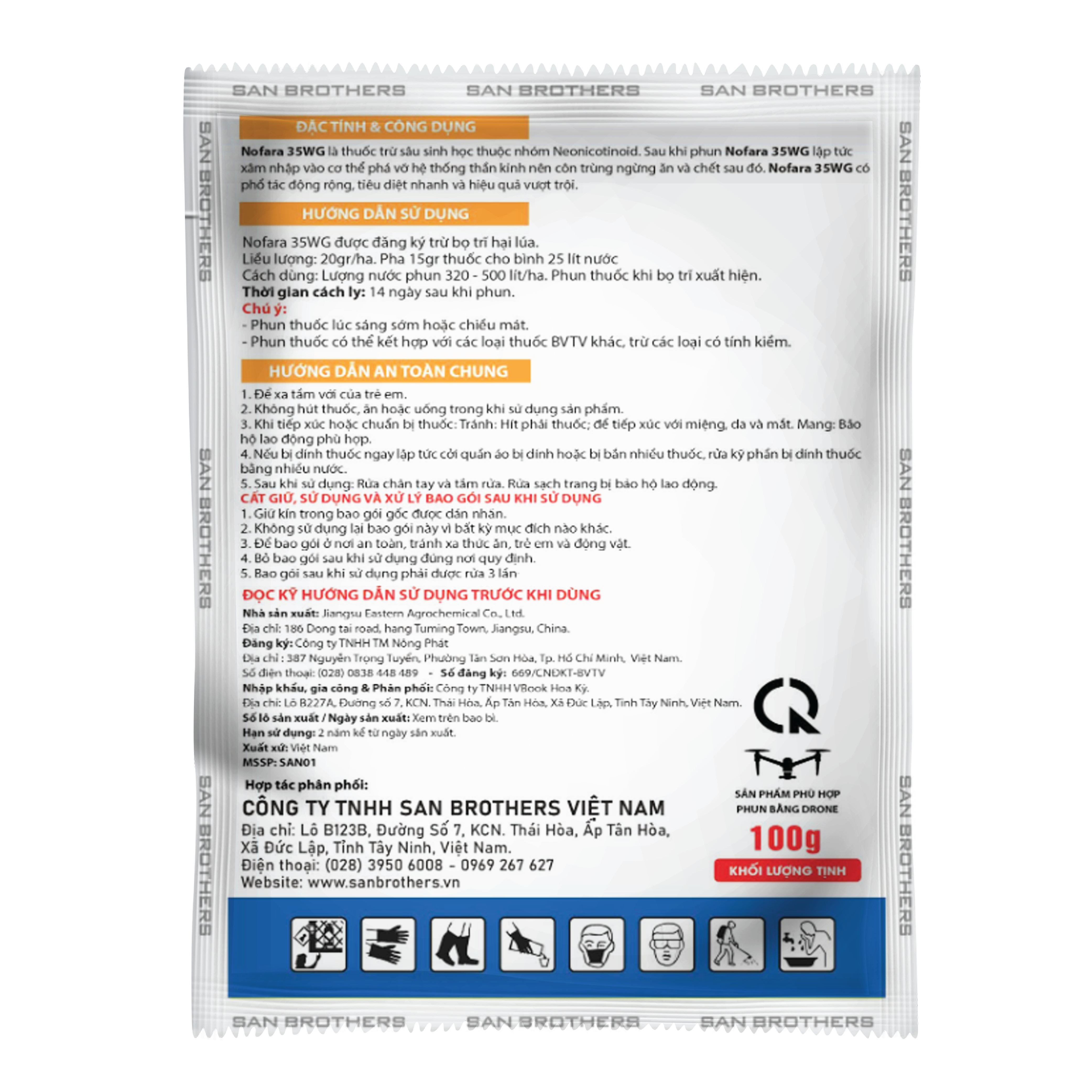TIÊU DIỆT NHANH - HIỆU QUẢ VƯỢT TRỘI ______________________________________________________________________________________ Quy cách 100g x 150 gói Công dụng - SAN-RAIZERO là thuốc trừ sâu sinh học thuộc nhóm Neonicotinoid, hoạt động bằng cách tác động trực tiếp lên hệ thần kinh trung ương của côn trùng. Sau khi phun, thuốc nhanh chóng xâm nhập qua da hoặc hệ tiêu hóa của sâu hại, gây rối loạn chức năng thần kinh, khiến chúng ngừng ăn ngay lập tức và chết sau đó trong thời gian ngắn. - SAN-RAIZERO có phổ tác động rất rộng, hiệu quả cao với hầu hết các loại côn trùng chích hút phổ biến và khó trị. Ngoài ra, với dạng hạt cốm hòa tan (WG) SAN-RAIZERO dễ sử dụng, tan nhanh trong nước, ít gây mùi, an toàn với cây trồng và thân thiện với môi trường, phù hợp với xu hướng sản xuất nông nghiệp an toàn, bền vững. [...]