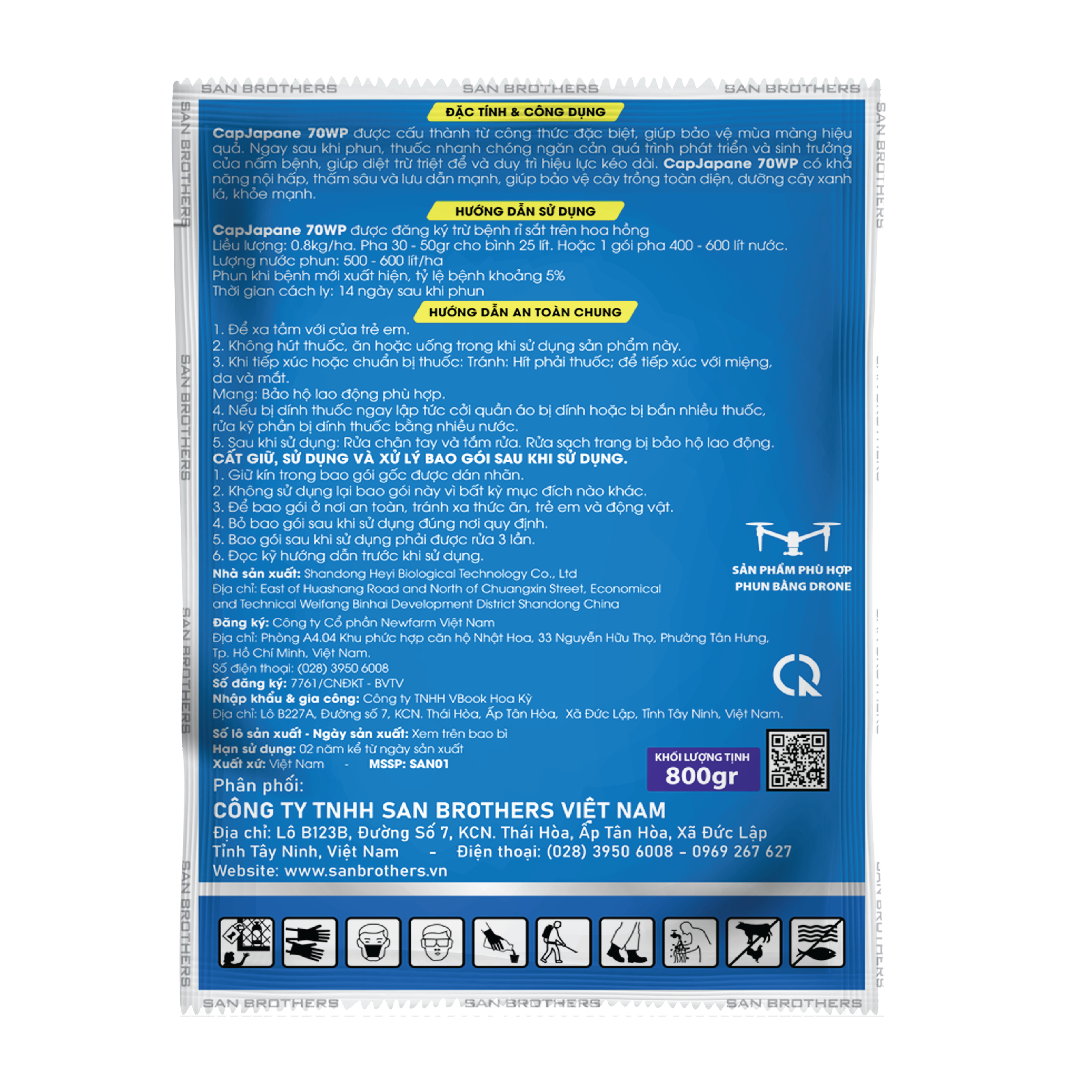 SẠCH BỆNH - XANH LÁ - BẢO VỆ TOÀN DIỆN ______________________________________________________________________________________ Quy cách 800g x 25 gói Công dụng - SAN-ANTI SENES được cấu thành từ hỗn hợp độc đáo trong việc bảo vệ mùa màng. Ngay sau phun, hoạt chất Propineb lập tức ngăn cản quá trình trao đổi chất và Tebuconazole ức chế sinh tổng hợp ergosterol của tế bào làm cho nấm bệnh chết tức thì với hiệu lực kéo dài sau đó. - Kết hợp giữa tác động tiếp xúc + lưu dẫn, sản phẩm vừa ngăn chặn mầm bệnh bên ngoài, vừa loại bỏ tác nhân gây hại bên trong, giúp cây trồng luôn xanh khỏe - sạch bệnh - nâng cao năng suất. [...]